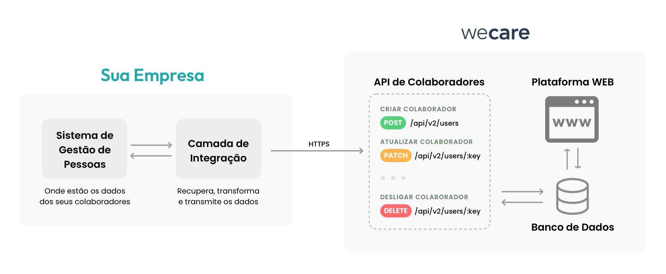 - API de Colaboradores da WeCare: recebe os dados via HTTPS e atualiza a Plataforma Web.