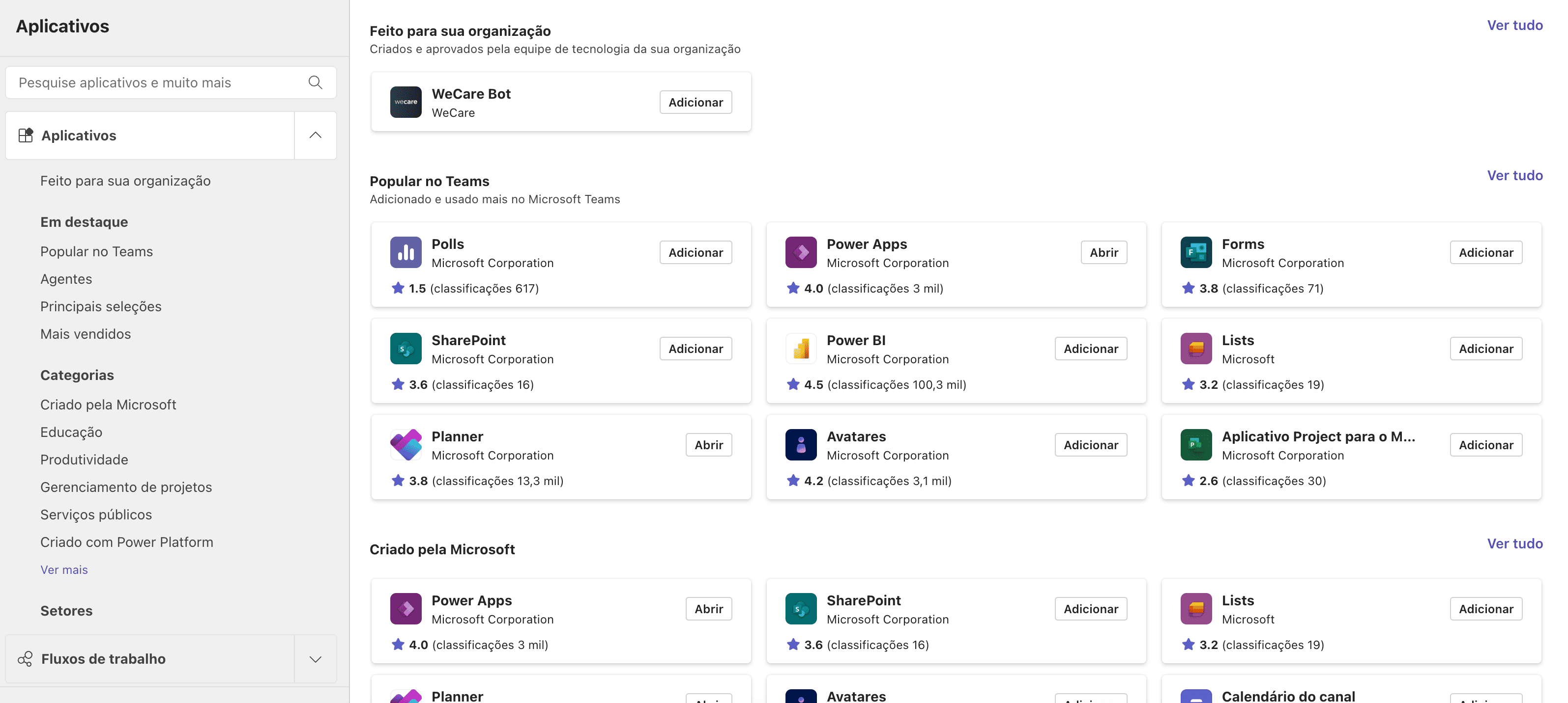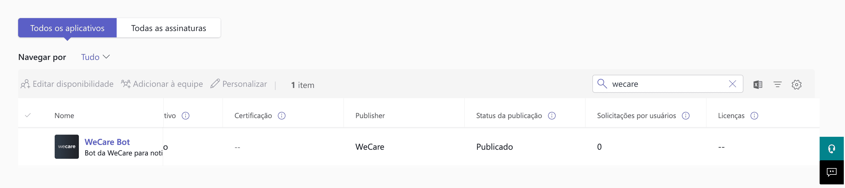 Entre em Aplicativos. O WeCare Bot estará presente na lista de aplicativos Feito para sua organização.