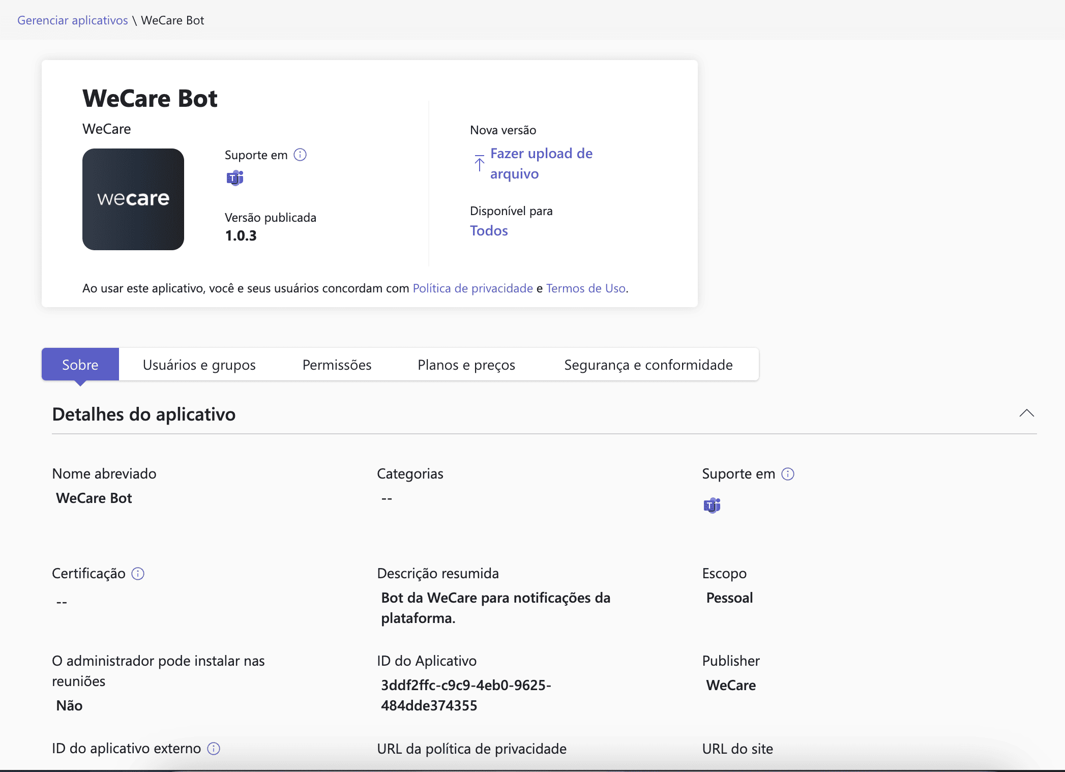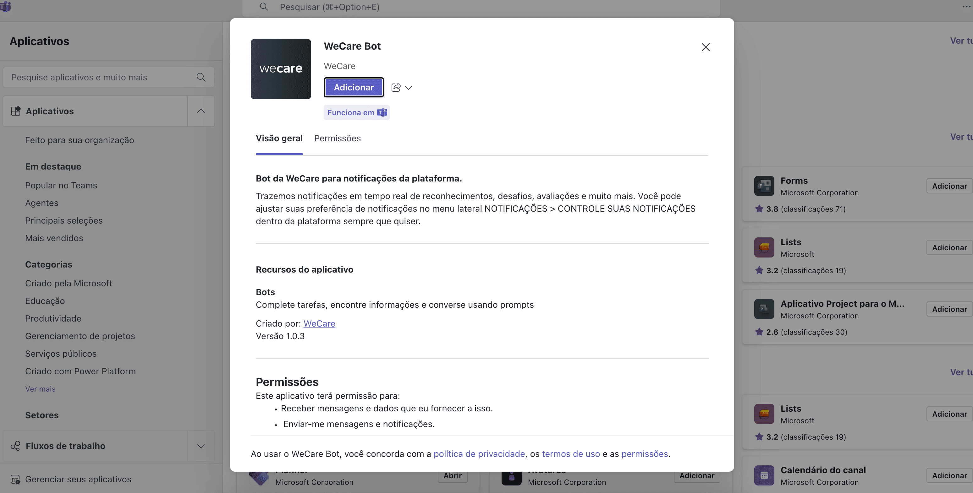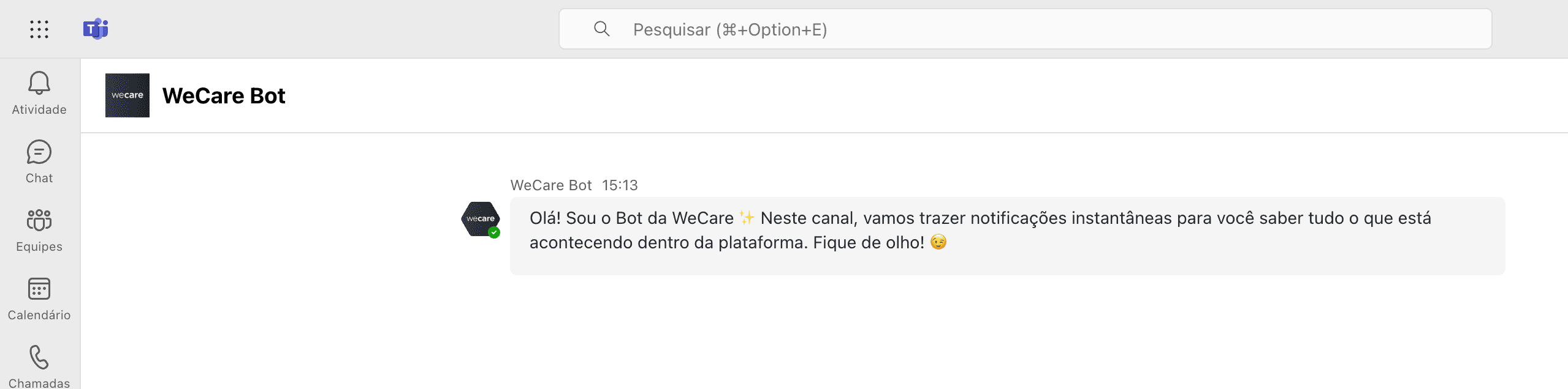 A WeCare disponibiliza um bot para notificações em conversas privadas no Microsoft Teams. Para disponibilizar essa integração aos seus colaboradores, siga os próximos passos.